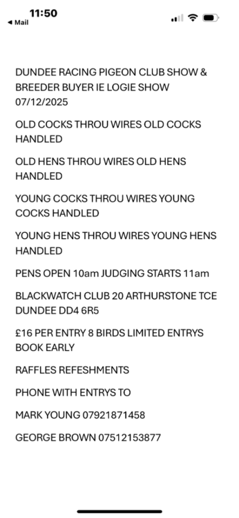 Gourdon & Dist RPC Show Going to be held in the Masonic Hall , Inverbervie on Sunday 30th Nov Class 1 AACTW Class 2 AAHTW Class 3 LOC Class 4 LOH Class 5 LYC Class 6 LYH Class 7 EYESIGN (TBC ) Penning 930 - 10.30 £1 per bird Teas ,coffees, bacon rolls ,sausage rolls , sale of 2026 ybirds Contact David Hay jnr 07961846919 , David Hay snr 01561361526