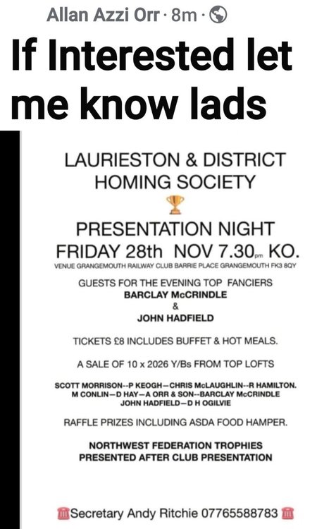 Federation Agenda Annual General Meeting and prize giving will take place Sunday the 7th December 2025 at 11am At Whitehills Public Hall, 2 Reidhaven Street, Whitehills, Banff AB45 2NJ (Please note venue change) AGENDA Adoption of the minute for the 56th Annual General Meeting held on the 8th December 2024 Matters arising. Balance sheet for the year to th November 2025. Presidents address Election of office bearers PresidentPaul Thomson (E) Proposed – Deveron Valley, Inverurie Senior Vice PresidentStuart Maskame (PD) Proposed – Deveron Valley, Inverurie Junior Vice PresidentAlex Fulton (DV) Proposed – Deveron Valley, Inverurie Secretary/TreasurerRuth Cordiner (PD) Proposed – Deveron Valley, Inverurie Race Controller Vacant Transport ManagerAbby Milne (DV) Proposed - Deveron Valley, Inverurie Driver John Harvey (DV) Proposed – Deveron Valley Results Co-OrdinatorGeorge Duthie Proposed – Deveron Valley SHU Delegate Sandy Milne (INV) Proposed – Deveron Valley PROSandy Milne (INV) Proposed – Deveron Valley, Inverurie Fed Show Convenor PROPOSALS The Federation reduces the annual federation fee to £50 (INV) Federation should have a savings account. Balance sheet to show where funds are housed and the savings interest rate. (FDFC) Federation to have a draft 2/3 year plan. Where we are aiming to be. (FDFC) One member from each club to have admin access to existing Fed Facebook page. (FDFC) Inverness club to have their birds picked up in Inverness from their club. (INS) If the above proposal is rejected the Inverness club members be given a membership fee concession (discount) to cover the cost of the additional expenses their club incurs having to cover a 3 hour trip which includes fuel costs every time we take part in a race. (INS) The Federation find an alternative for the Brechin lib site due to the over presence of B.O.P. (INV) 2 weeks break between the last old bird race and first young bird race. (E) 3 week break between end of old bird racing and start of young bird racing, reason being incase Old birds increase by a week due to adverse weather (DV) 2026 race season to commence the second week in May (9/5/26) (INV) Old bird racing to start 2nd May (E) Old bird racing to start 18th April (DV) Old bird racing to start 25th April (FDFC,PHD) Young bird racing to start 18th July (FDFC, DV, PHD Old bird programmes.
