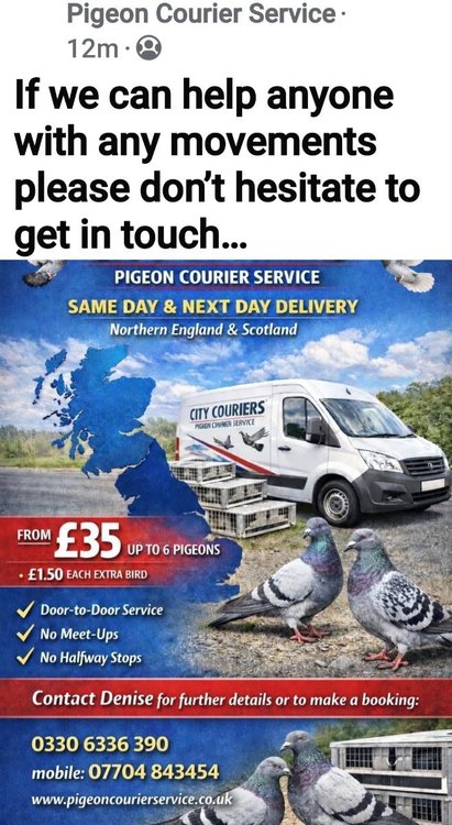 Copied from Facebook 21st January 2026 🕊️ Quick Update – City Couriers Pigeon Courier Service 🕊️ 🚚 Collections available TODAY throughout the North East for our Scotland run tomorrow. It’s not too late to book. £40 for up to 6 birds from the North East to Scotland with next day guaranteed delivery !! 🚚 Thursday Route: North East (NE) → Lancaster (LA) → Dumfries (DG) → Glasgow (G) → Fife (KY) → Edinburgh (EH) → Berwick-upon-Tweed (TD) → back to Newcastle (NE) 🚚 Friday Route: Newcastle (NE) → Durham (DH) → Leeds (LS) → Manchester (OL / M) → Liverpool (L) → Sheffield (S) → back north to Newcastle (NE) ✅ Same-day collection & delivery on route (Thu & Fri) ✅ Scotland collections on Thursday delivered in England on Friday – GUARANTEED ✅ Clean, ventilated vehicles with experienced handling 📦 Spaces still available 💷 Prices from just £35 for up to 6 pigeons If your birds fit in with this route, get in touch to secure a space. 📞 0330 6336 390 🌐 www.pigeoncourierservice.co.uk 🕊️ Reliable • Planned • Trusted