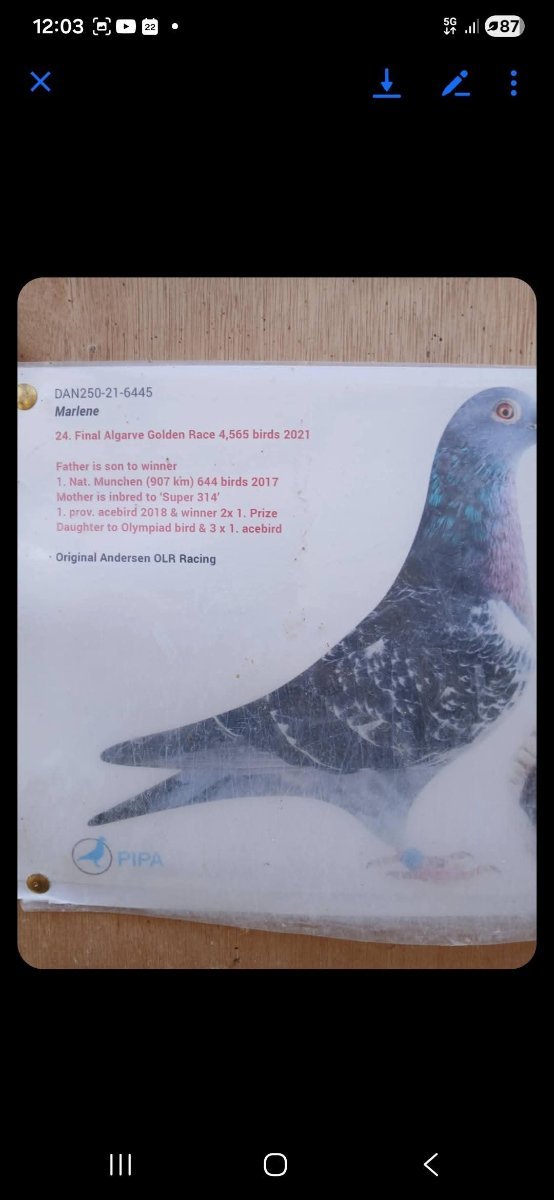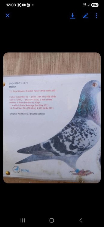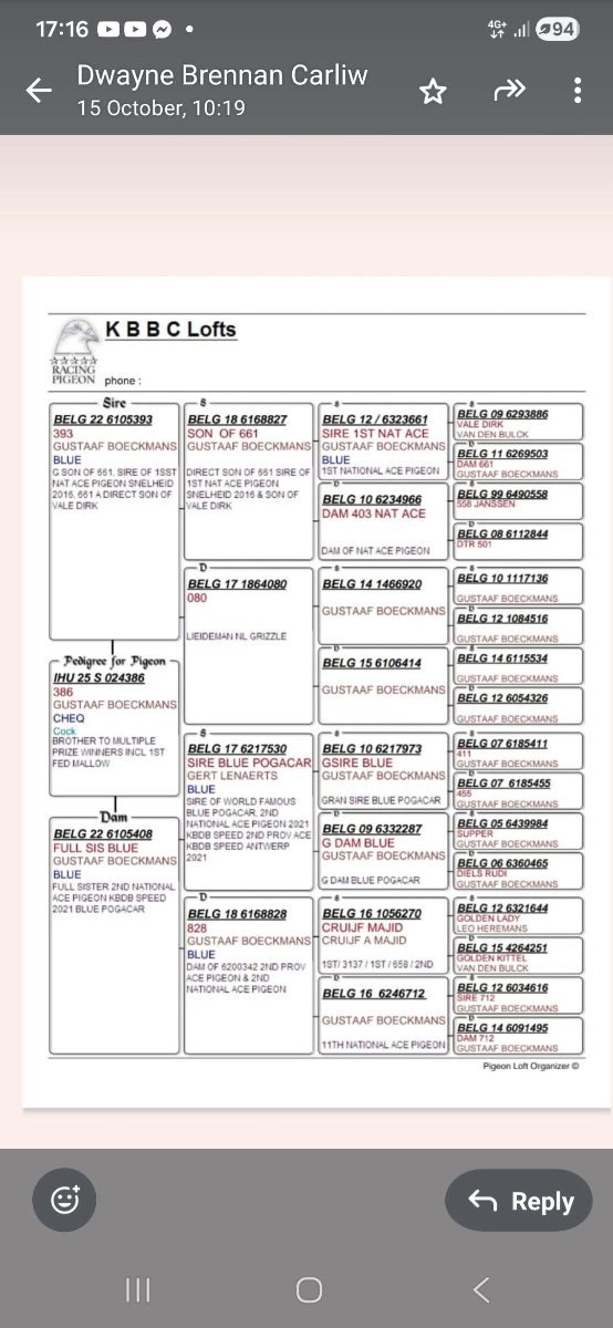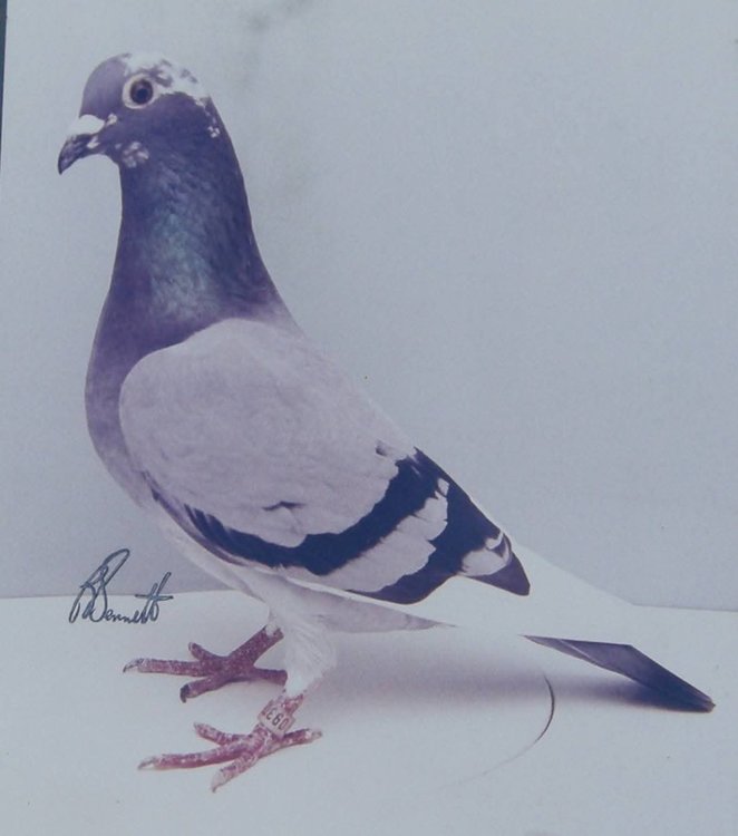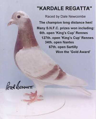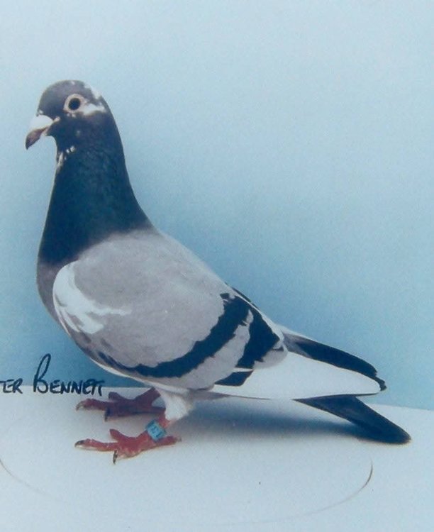 Move forward to 1993 and Philip gained his second National win. Pigeons competing with the S.N.F.C. from Nantes formed part of a large convoy including birds from several North of England organisations. The race was planned Saturday for 3rd July and whilst the English entry was released on schedule, the S.N.F.C. entry was āheld overā due to an unfavourable weather forecast for the North of England and Scotland. Conditions were no better the following day but with an improved forecast on the Monday the Scottish entry was released at 8.30am on Monday 5th July into a light North wind. The race proved difficult with no arrivals on the day of liberation. Philip Heslop timed at 9.17am on the second day to head the result on 822ypm, 43ypm ahead of the second pigeon in the result with the second pigeon in the Section being 6 hours behind the race winner. Philip only had a single bird at the race but it was but it was a right good one, having scored on several occasions as youngster including 17th Section 216th Open from the Y.B. National. She wasnāt raced as a yearling as she was injured but was back on the road as a 2 y.o. going through the programme to Sartilly being 39th Section 56th Open. She went to the channel again as a 3 y.o. on this occasion being 46th Section 154th Open Rennes. The intention was in 1993 to send her to Rennes again and in preparation she was paired in early March and reared a pair of youngsters, thereafter going to four inland races with the Federation through to Cheltenham with the plan being to set her up for Rennes. She threw her third and fourth flights together however, which prompted Philip to change her race to give the new flights ātimeā to grow and went to Nantes covering 12 day eggs. The National winner was a Blue Pied hen that was bred by Ian Axe, the Dam a dark eyed Blue Chequer bred by Robert Venus, bloodlines being Jan Aarden containing long distance lines through to Barcelona with the noted āDolleā being quoted prominently in the pedigree. Sire was Blue Delbar cock āBrianā, Sire of many winners through to 500 miles. He was out of two direct Delbar imports, āLa Roseā and āLe Sirrocco. āLe Sirroccoā that was out of a 1964 Blue hen when paired to āPetit Blueā 1st National Libourne. As explained Philipās first National winner was named āNewington Sharlisaā with the Nantes winner being named āNewington Martinaā.