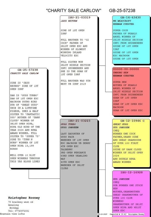 In 1990 Philip realised an ambition to win a Scottish National when he headed the result from Sartilly (1) with āNewington Sharlisaā. The convoy was released at 6.30am with Philip timing the winner at 3.20pm, recording a velocity of 1449ypm and heading the result by 52ypm. āNewington Sharlisaā was a 1988 bred Blue Pied hen that had two races as a youngster and went to Dorchester as a yearling. She was coupled during the third week in February 1990 and reared a pair of youngsters in her first round, was dummied on the second round and was then set down for Sartilly on her third round of eggs, going to the race covering ten day eggs. In preparation she went to five inland races to Cheltenham and was then given five training tosses with her fifth toss being from Windermere that is off the regular route on which the Solway birds work, which meant that she had to āthinkā to negotiate her way home. The Sire of āNewington Sharlisaā was a Blue Pied Delbar cock, which Philip obtained from Ian Axe. Dam was a Dr. Manil Delbar Grizzle hen that Philip had on loan from friend Alex Graham, having been bred by Alan McCulloch. Having said that the Dam of the Pied hen was received on loan from Alex Graham, in should be explained that in former years I worked at the Cochran Boilerworks and as part of my job I interfaced with a several fanciers who worked in other Departments with one such fancier being Alex who was a Product Inspector and as the years passed, he and I became close friends. Alex had an interest in the pigeon hobby having been influenced by his father, Willie Graham, who was a very able fancier and close friend of John Kirkpatrick, indeed when JK was suffering from a terminal illness in his final years, Willie assisted him to care for his pigeons. With his fatherās team at the back door of the family home and visiting the loft of John Kirkpatrick with his father, one could understand why Alex was steeped in our hobby. He told me often of being at John Kirkpatrickās loft when āGalabank Princeā and āGalabank Dukeā homed from Nantes in 1952 to be 1st and 2nd Open National. He said that when the first pigeon arrived, John Kirkpatrick was in the house shaving and his father was in the loft. The pigeon hit the platform and Alex alerted his father, telling him the yellow one was home. He told me that āGalabank Princeā was a pale Red and was known by John Kirkpatrick and his father as āthe yellow cockā. His father timed the pigeon and John Kirkpatrick came out of the house half-shaved. Following the death of John Kirkpatrick, Willie raced the team for a further season in the name of Mrs. Kirkpatrick and in 1954 was 3rd Open from S.N.F.C. Rennes with āGalabank Remembranceā. In time Alex married, with his wife Margaret, being the daughter of Alan McCulloch from Waterloo, Wishaw, who was another super fancier. Alan was 2nd Open S.N.F.C. Rennes 1952 and importantly had the magical ability to produce quality pigeons on a regular basis. Following his marriage, Alex entered the fancy in partnership with friend Adam Donaldson, with Margaret ābehind the scenesā actively contributing to the success story. On forming their loft, Alex and Adam used the Kirkpatrick lines of Willie Graham, stock obtained from friends in West Cumberland and introductions from Alan McCulloch. Over the years they gained a number of successes, including 1st Section Avranches 1981 and 1st Section Sartilly 1985. They additionally won an S.N.F.C. Gold Award with their winner having scored from the channel with the S.N.F.C. on eight occasions and in 1969 won the Young Bird National. Alex had a great eye for a pigeon and having been beside him, on visiting lofts, was well aware that he always but always selected the best pigeons in the shed. On the day before basketing for the Sartilly National in 1990 he called me on the internal phone at our work and said ācome with me tonight to Philip Heslopās and handle the Blue Pied hen heās sending to Sartilly, it will be a first time ever Billy, the scribe has attended at the loft and handled the National winner before it went to the raceā. He added āI was there last night and had a hold of it, itās an absolute topper, is in marvellous order and it wouldnāt surprise me one wee bit if it came out and won the Nationalā. Well, Alex was a bit of a joker and believing it to be a wind-up, I chose not to go. Well as explained above, the Pied hen did indeed win the National and in retrospect, I maybe should have heeded my friendās advice.