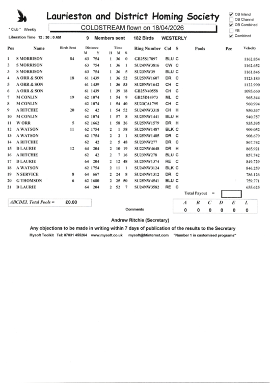 15. 7 Members sent 174 birds 1. JD Armour 1166 2. J&G Peggie 1165 3. JD Armour 1121 4. JD Armour 1120 5. JD Armour 1120 6. JD Armour 1110 7. JD Armour 1099 8. M. Wiseman 1095 9. T.R.Stevenson 1083 10. JD Armour 1076 Well done Dyke, and everyone who made the result. D. Hunter wins the £5 nom, well done